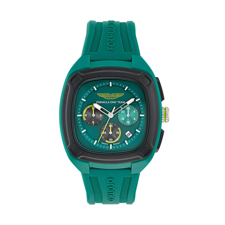 Designed with a bold, fully tonal aesthetic, this timepiece features a 44mm AMR Green case paired with a multifunction green dial and matching silicone strap. Subtle lime accents inspired by Aston Martin’s racing identity add a sharp contrast, delivering a refined yet performance-driven look.